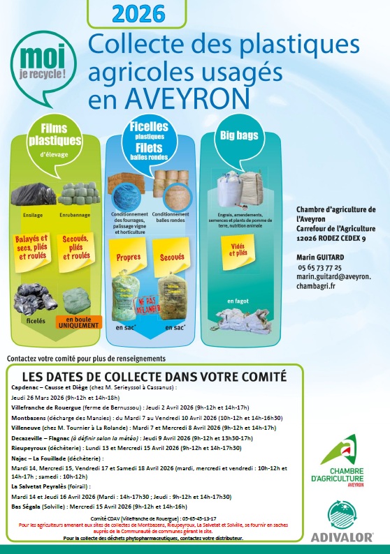 Les collectes des plastiques agricoles usagés (bâches d’ensilage, film d’enrubannage, big-bag, ficelles et filets) en vue de leur recyclage sont organisées par la Chambre d’agriculture en lien avec Adivalor
