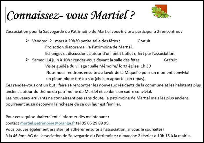 Pour information, la commune de Martiel relaie la liste des évènements culturels proposés sur le site d’Aveyron Culture https://www.aveyron-culture.com/agenda-et-stages/agenda-des-evenements