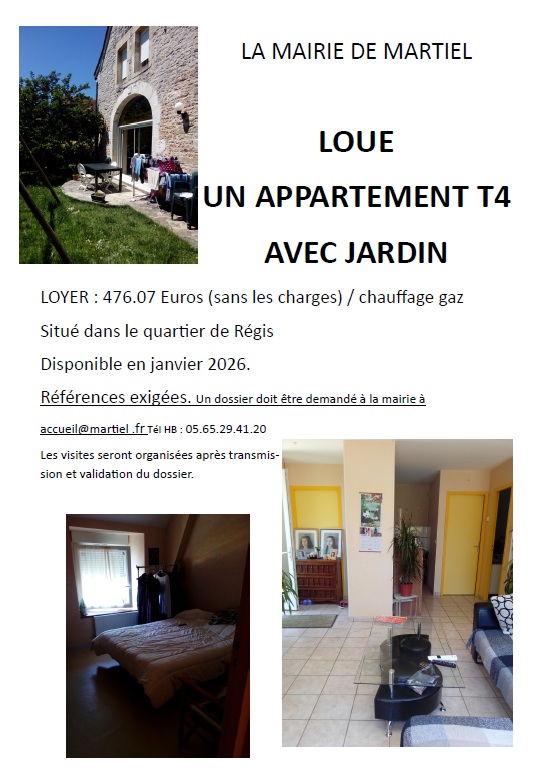 La municipalité de Martiel propose la location d’un T4 au lotissement Régis (bourg de Martiel)