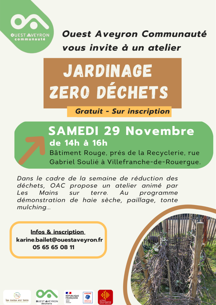 Dans ce cadre, Ouest Aveyron Communauté propose un atelier « Jardin zéro déchets », le samedi 29 novembre de 14h à 16h au bâtiment rouge, à côté de la Recyclerie, rue Gabriel Soulié, à Villefranche-de-Rouergue.