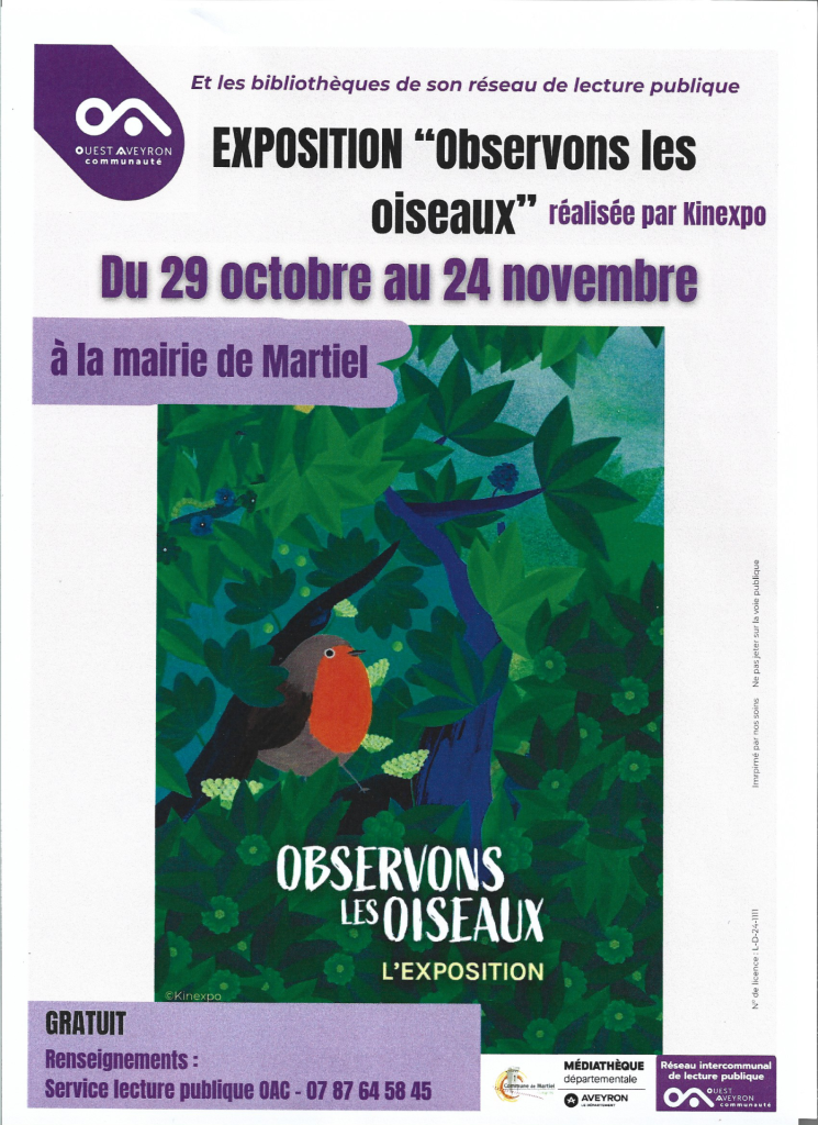 Petits et grands, venez voir et écouter les oiseaux du 3 Novembre au 22 Novembre à la Salle du Conseil de Martiel