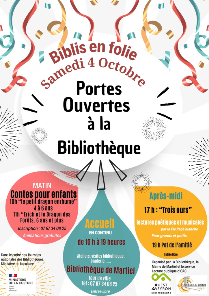 Dans le cadre des journées nationales des bibliothèques du ministère de la culture, les bénévoles de la bibliothèque de Martiel ont le plaisir de vous convier aux portes ouvertes de la bibliothèque le samedi 4 octobre 2025