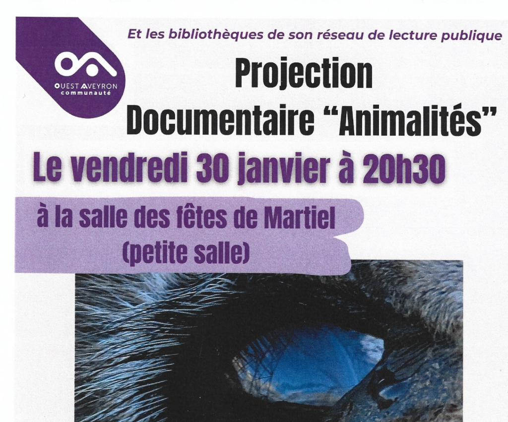 Projection du film « Animalités » Vendredi 30 Janvier à 20H30 à la salle des Fêtes de Martiel