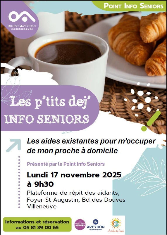 - Comme chaque mois, le Point Info Seniors vous invite au prochain P’tit Dèj’ Info Seniors qui aura lieu Lundi 17 novembre à 9h30, dans les locaux de la Plateforme de Répit des aidants (en face de l’EHPAD Marie Vernière), à Villeneuve. Nous vous présenterons, autour d’une collation, les différentes aides permettant de s’occuper d’un proche à domicile.